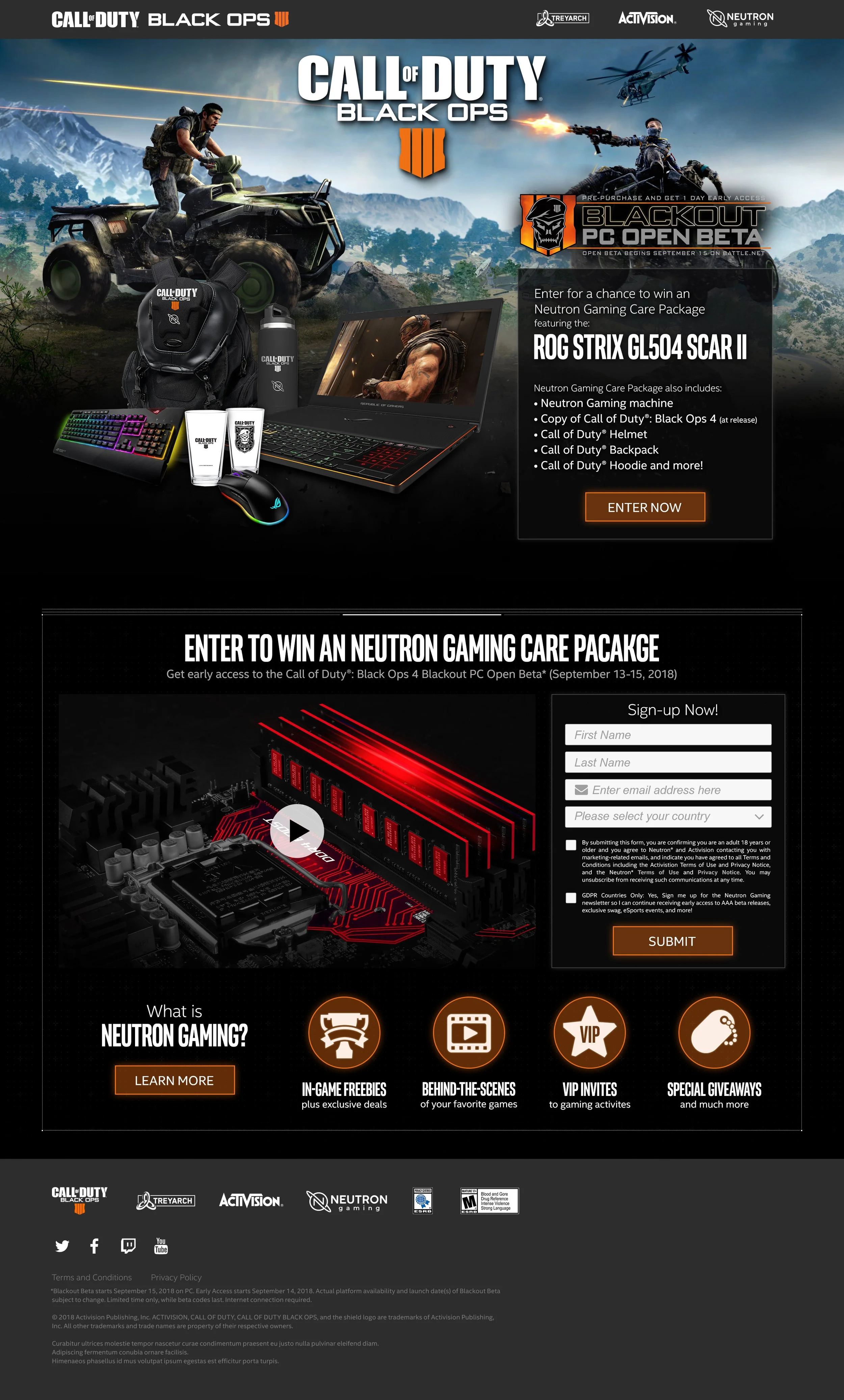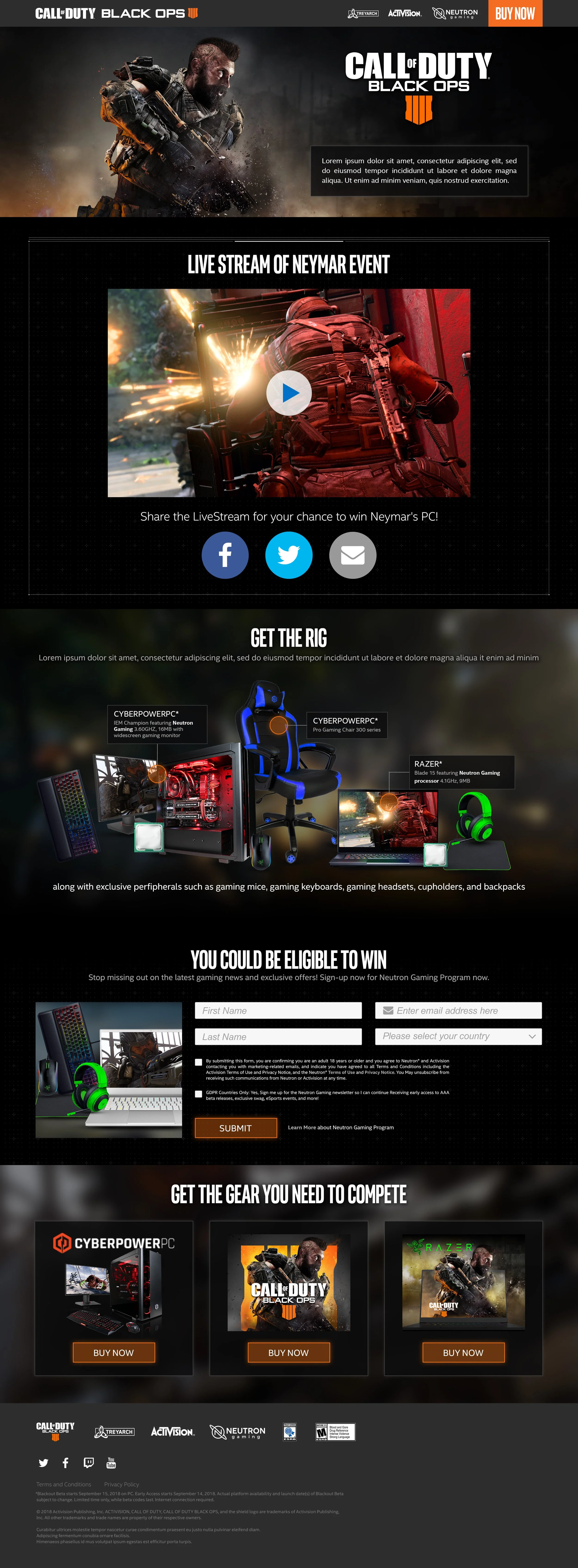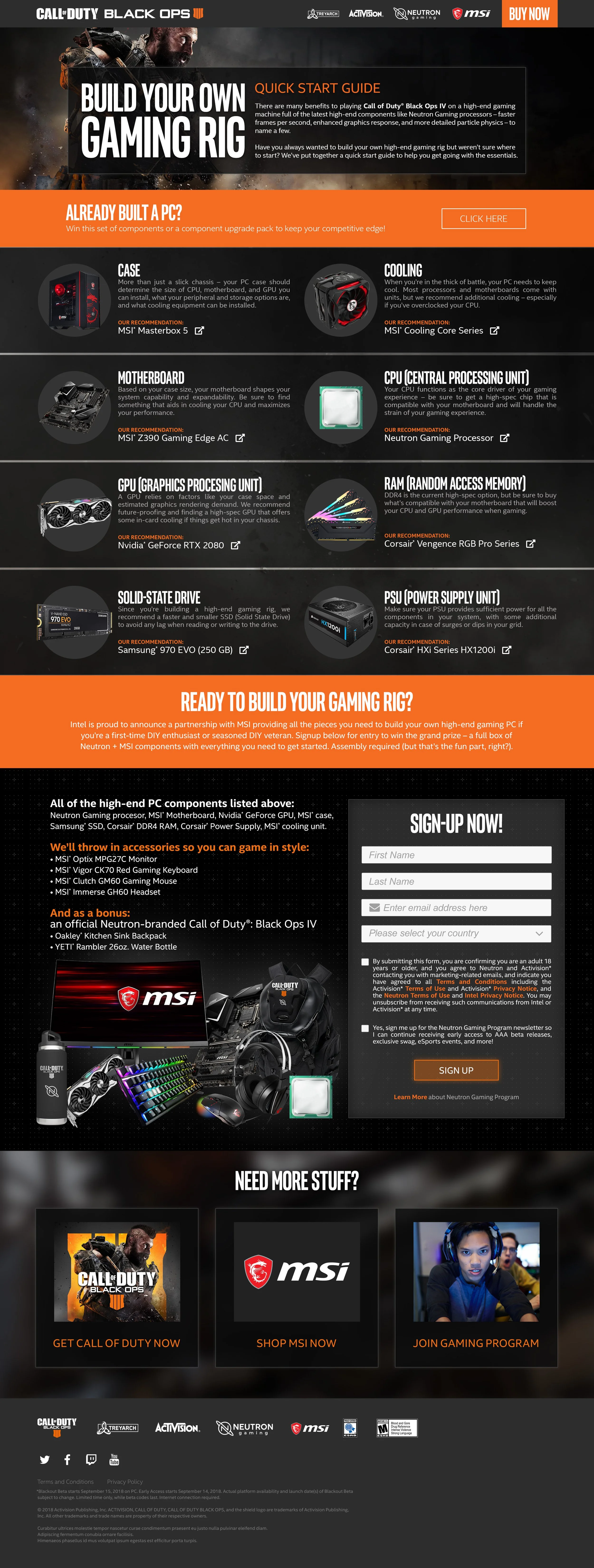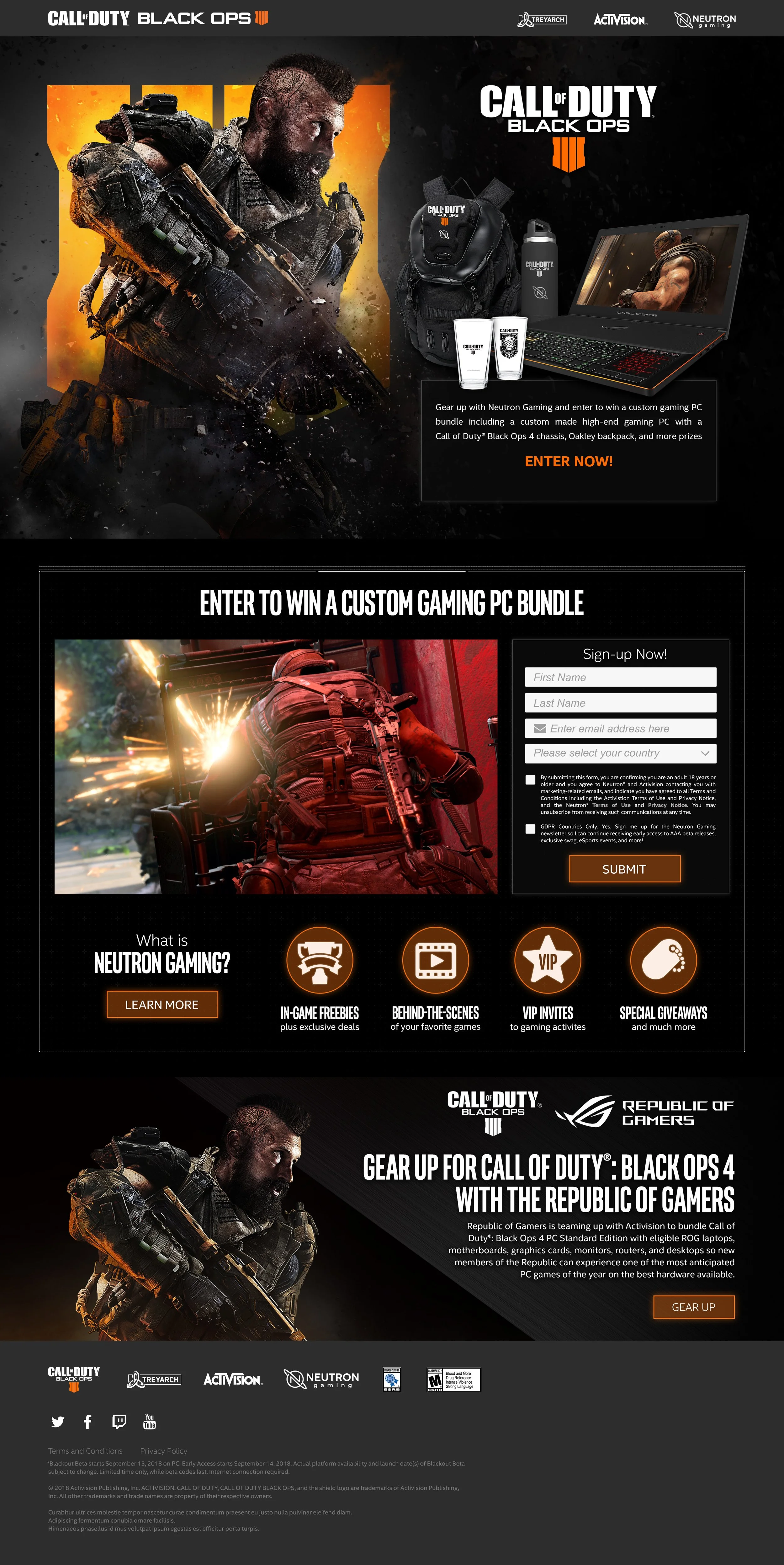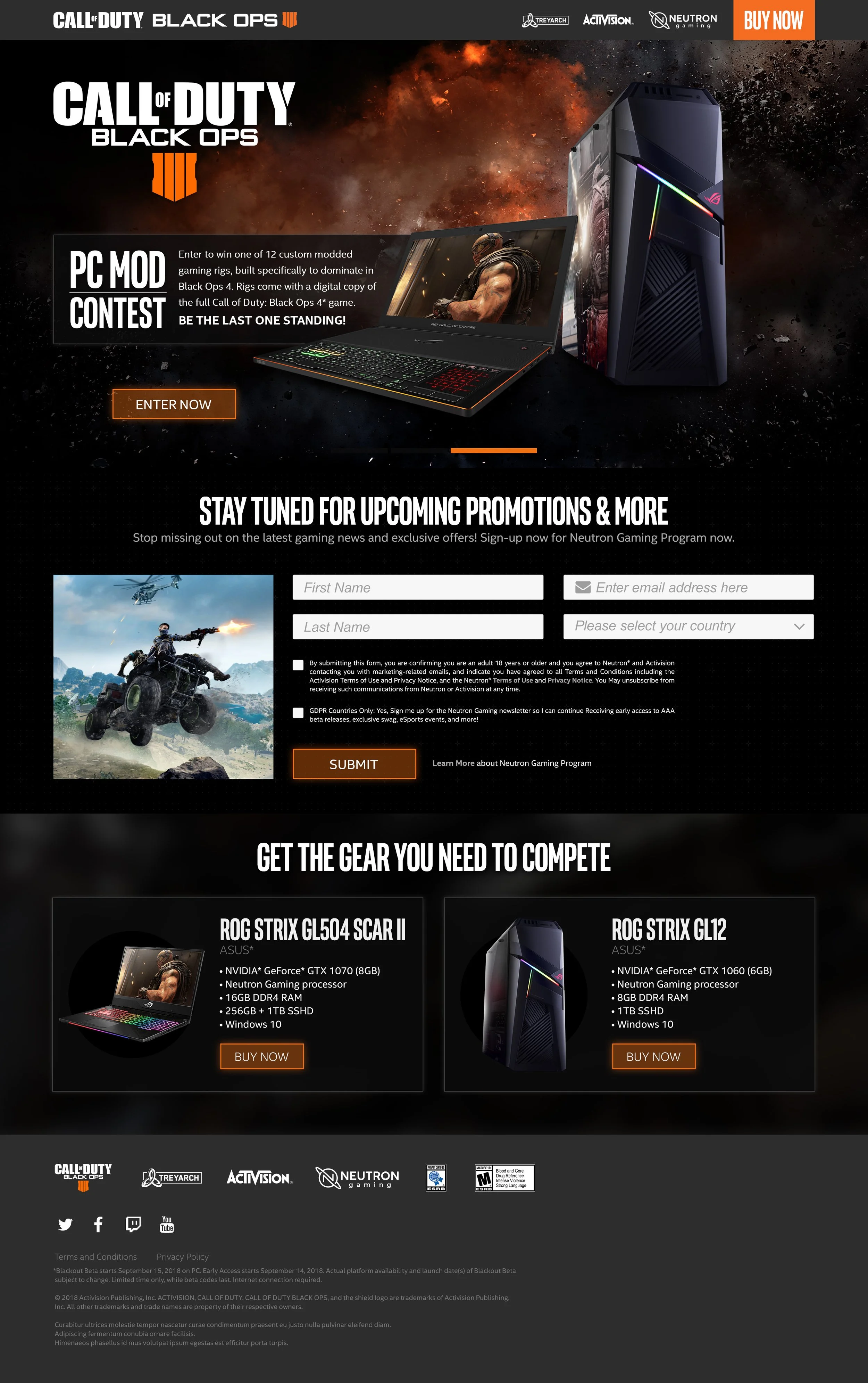 The intention of this project was to dive into a joint venture between Client and an Independent Software Vendor [(ISV) ActiVision] as well as numerous peripheral Partners (MSI, Asus, Dell, Lenovo, HP, CyberpowerPC, Razer, NVIDIA, Corsair, Samsung). Initiative efforts were focused on numerous co-marketing campaigns, that consisted of four independent sweepstakes, three influencer activations, and also included both merchandise and prizing fulfilments. The target market was consumer gamers, aged 18-35. Our primary focus was to promote the PC version of the Gaming Title by designing graphic campaigns that showcased amazing gaming capabilities and experiences on PC, coupled with the Clients proprietary computing processor chipset. Our objective was to develop enthusiasm for the Gaming Title among broader PC user/gamer segments and drive gamer engagement, purchase intent, sales, and breadth of PC SKUs (both mainstream and gaming segments).
